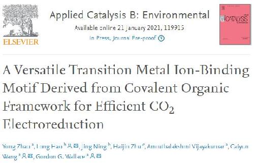 课题组和伍伦贡大学赵勇博士、王彩云教授、Gordon Wallace教授在Applied Catalysis B:Environmental 发表文章:COF源氮掺杂碳锚定过渡金属离子用于高效CO2电化学还原