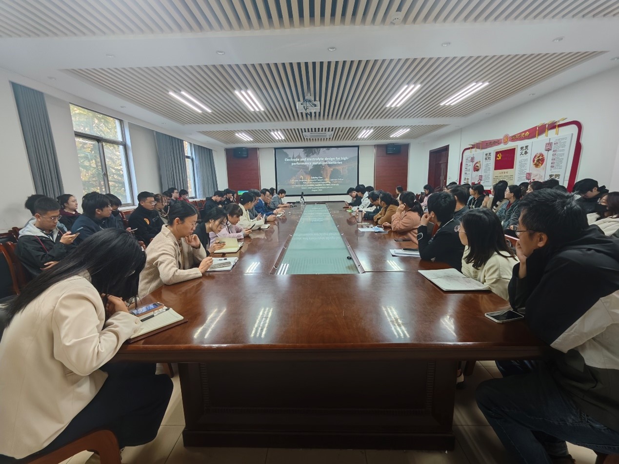 报告中,郭再萍教授详细介绍了金属离子电池电极及电解液设计领域的最新研究成果,郭教授及其团队在金属锂离子电池正负极材料、电解液以及水系锌电等方面取得了重要进展,特别是在电极材料的元素掺杂、表面涂层和合成特殊晶面材料方面。她指出,随着电动汽车、智能电网等领域的快速发展,人们对高能量密度电池的需求日益迫切,对此,她详细介绍了电极材料的创新设计思路,包括如何通过元素掺杂、表面涂层等手段提升材料的性能,以及合成具有特殊晶面结构的材料来优化电池性能。同时,还对电解液的设计和优化进行了阐述,强调了电解液在电池性能中的关键作用。最后,郭再萍教授与现场的师生们围绕相关问题展开交流讨论。