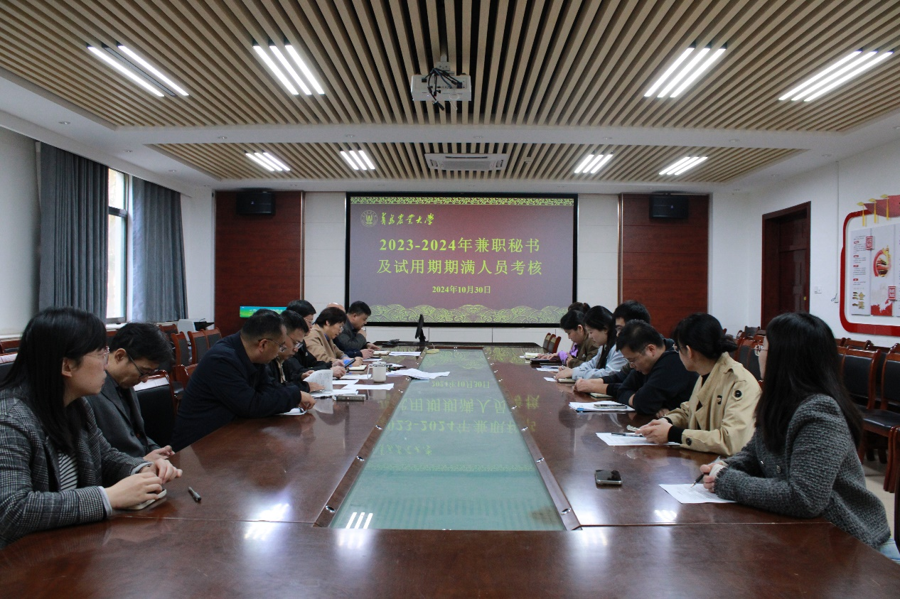 2024年10月30日,青岛农业大学天天莫天天爽学生妹于化学楼207对2023-2024年兼职秘书及试用期期满人员进行考核,学院党政联席会成员及各系主任出席考核会。