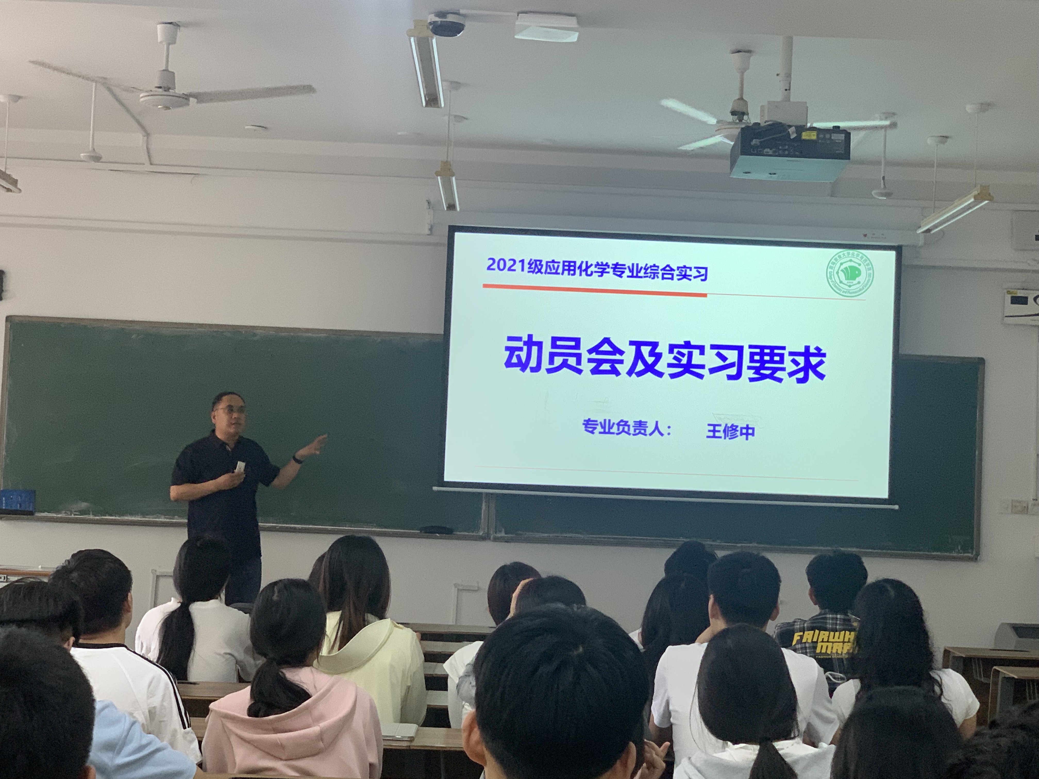 本届综合生产实习以化工和药物生产安全教育、模拟体验、现场观摩、讲解形式展开。实习第一天,由专业负责人王修中教授在校内对2021级全体学生进行实习前的动员,对实习期间的乘车和伙食安排等具体内容进行安排,重点强调了企业实习期间安全注意事项和实习结束后的实习的总结和实习报告的提交等。