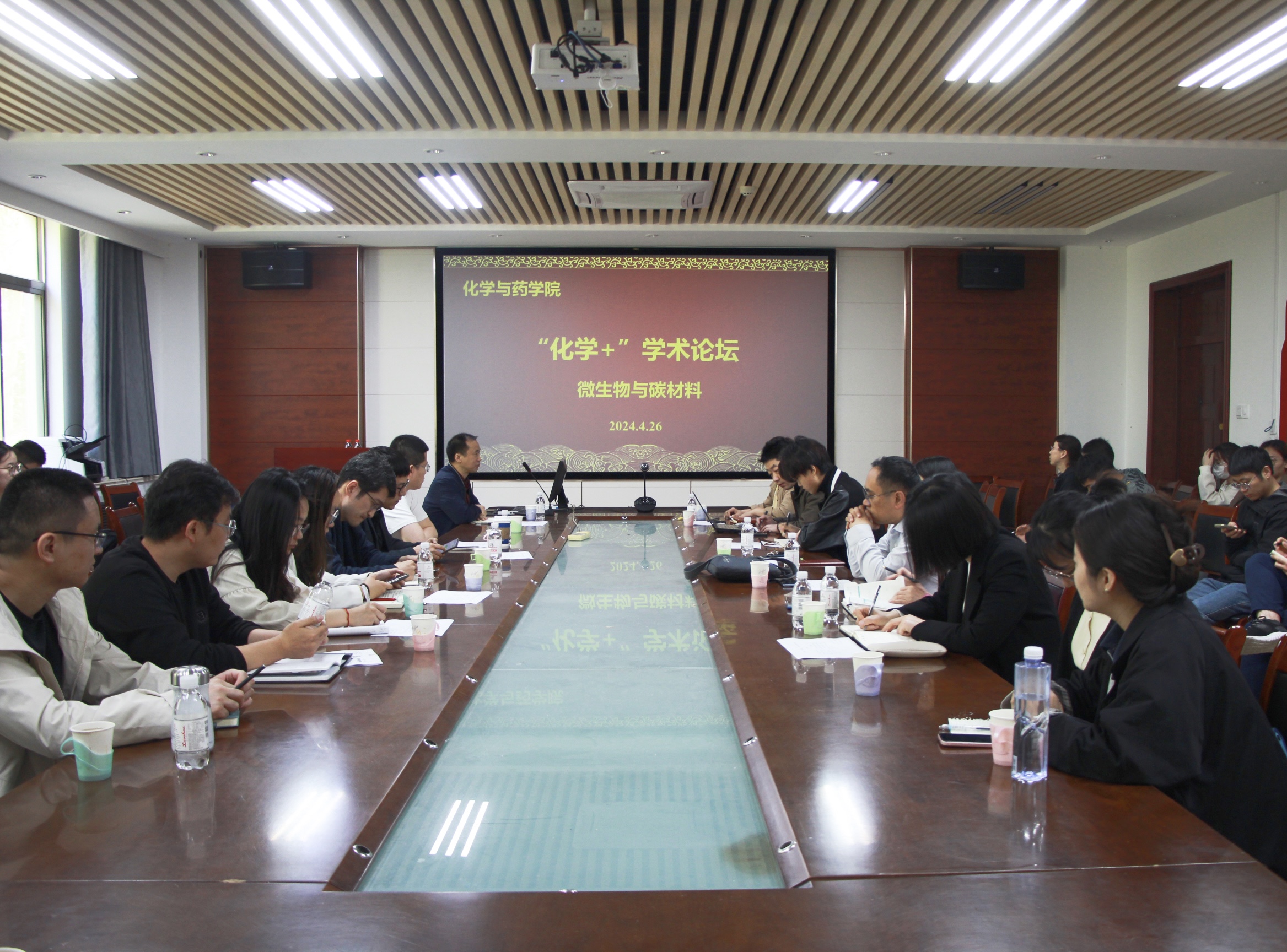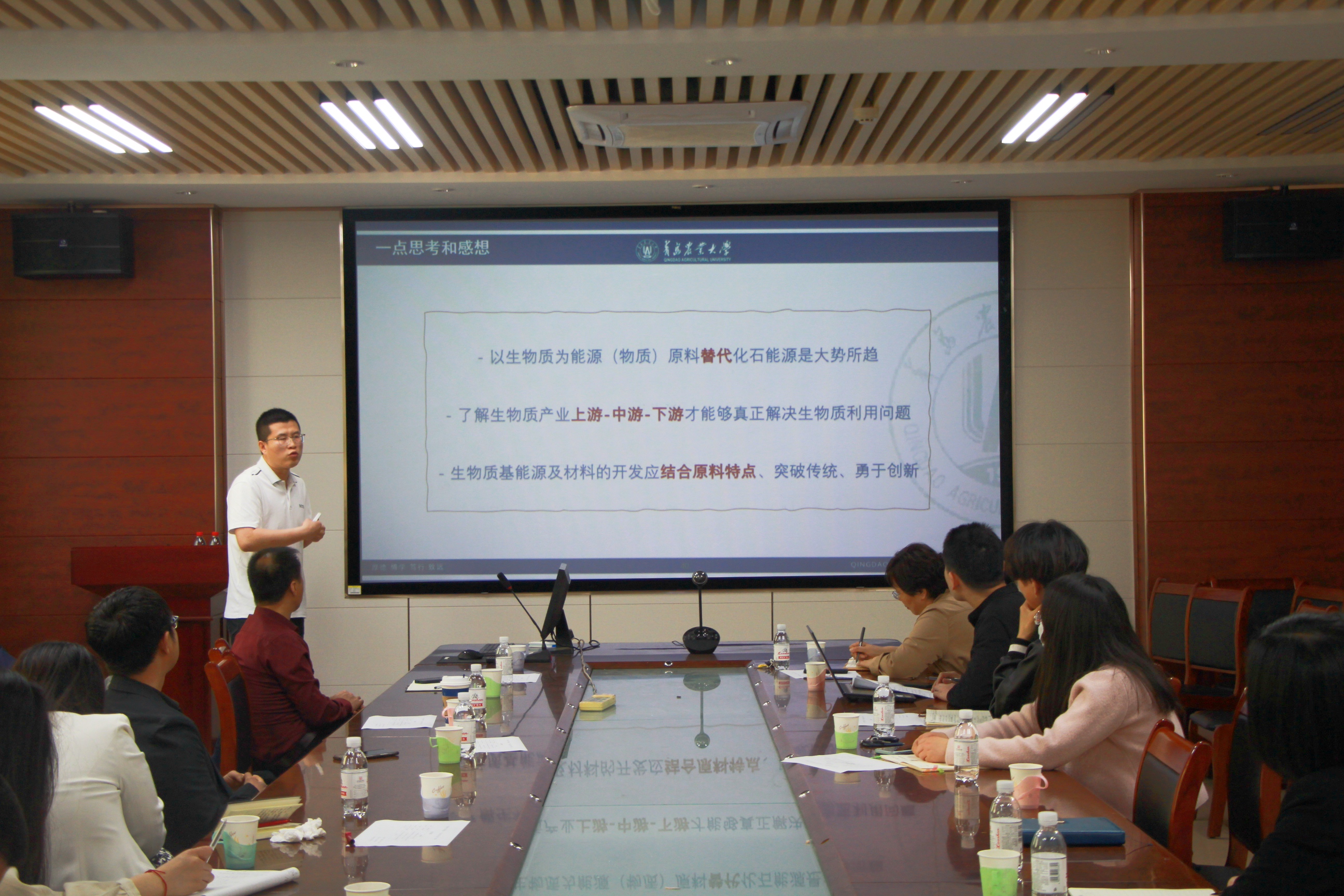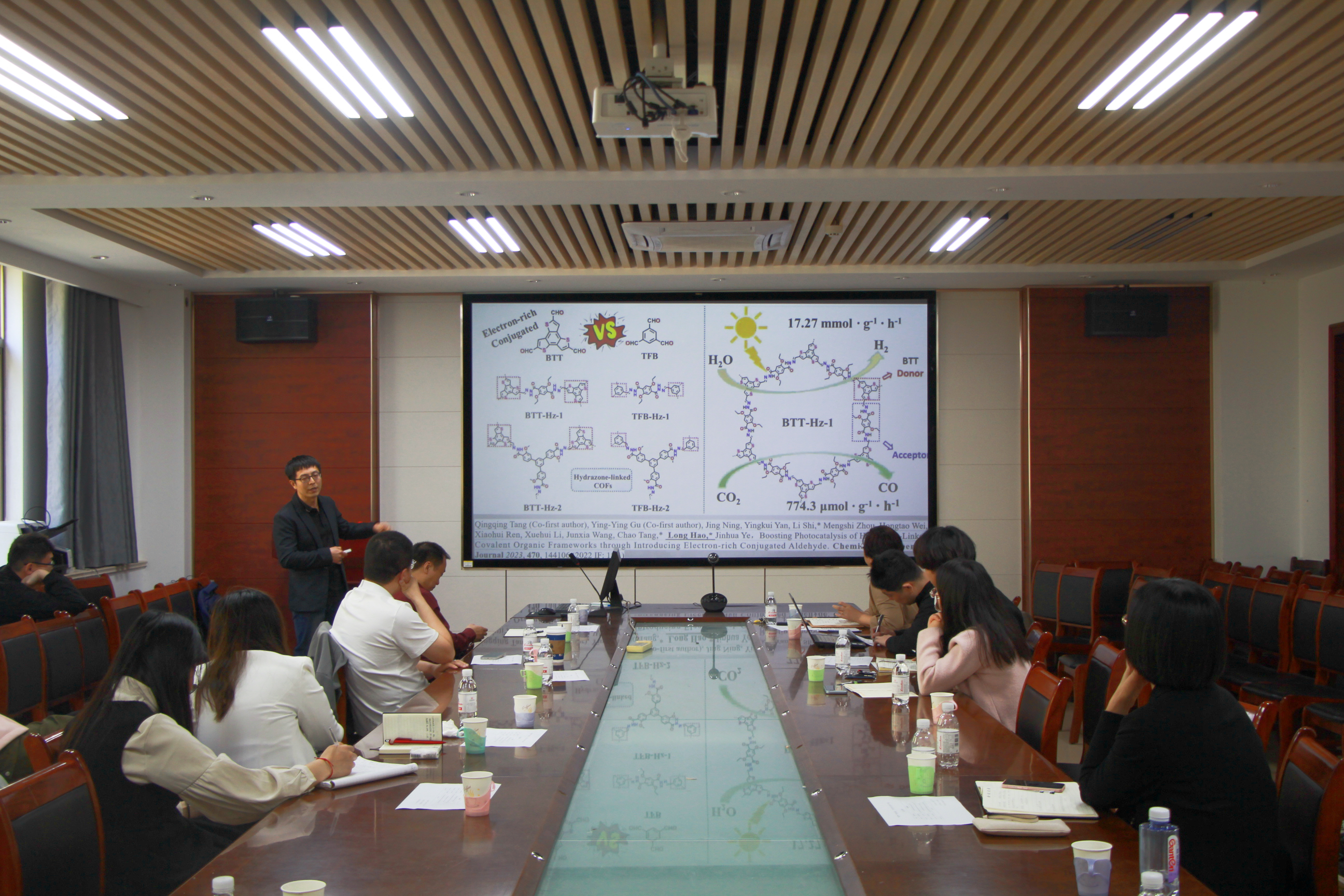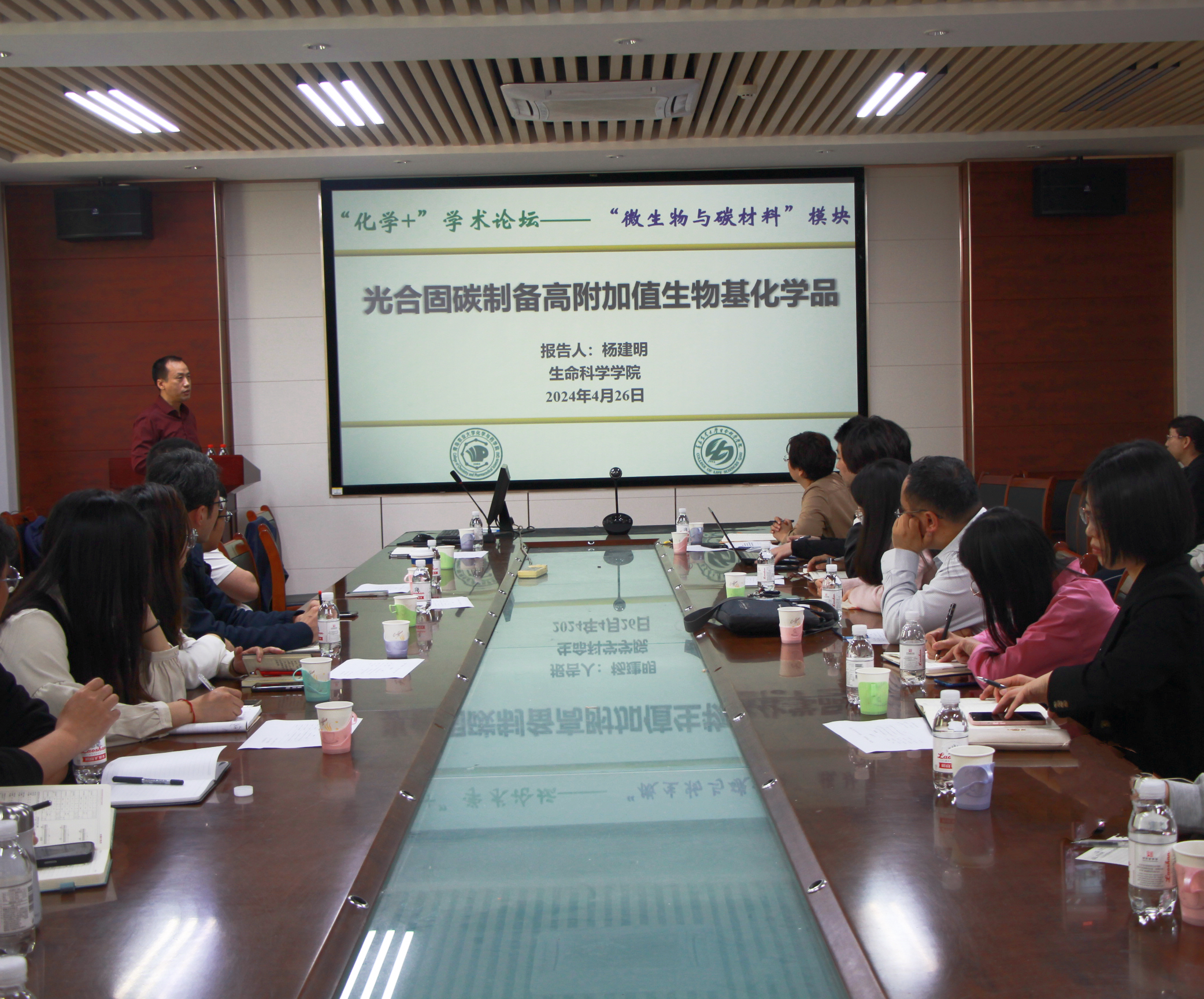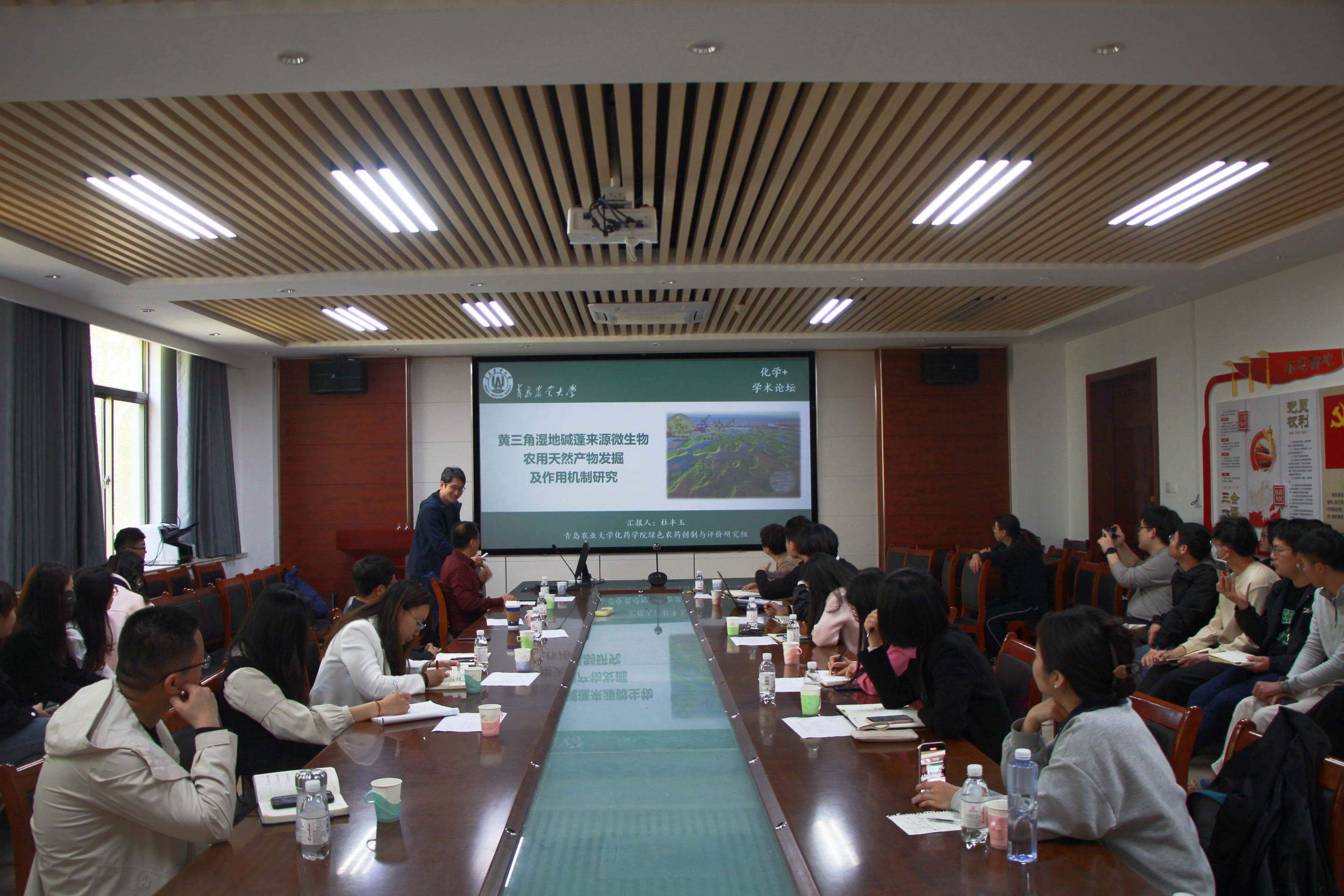 讲座伊始,龚良玉介绍举办“化学+”学术论坛的目的是共同交流探索学科交叉融合发展的新路径,引导师生结合学校农科及生命科学学科优势,发挥“化学+”作用,进行学科方向凝练,寻找新生长点。“化学+”学术论坛将分为多个系列进行开展,邀请校外、校内专家介绍前沿领域。龚良玉代表学院对四位专家的受邀参与表示热烈欢迎,并介绍了四位专家的学术成果和研究方向。杨建明教授报告以《光合固碳制备高附加值生物基化学品》为题,分别从Rhodopseudomonas palustris介绍、R.pal微生物生理学研究、R.pal作为细胞工厂产萜类物质研究、C.necatorH16细胞工厂的研究等方面展开介绍。杜丰玉教授报告以《黄三角湿地碱蓬来源微生物农用天然产物发掘及作用机制研究》为题,介绍碱蓬来源微生物多样性及其农用潜力发掘、菌株特性等方面的内容。曲望达教授报告以《木质素基碳材料合成与应用创制》为题,结合新旧动能转化的背景,讲述了木质素基碳材料合成与应用创制的想法和措施。郝龙副教授报告以《共价有机框架(COF)材料》为题,从含杂原子COF单体的高效合成、光催化反应的COF结构构建及其构效关系研究、用于荧光检测的COF结构构建及其构效关系研究展开介绍。