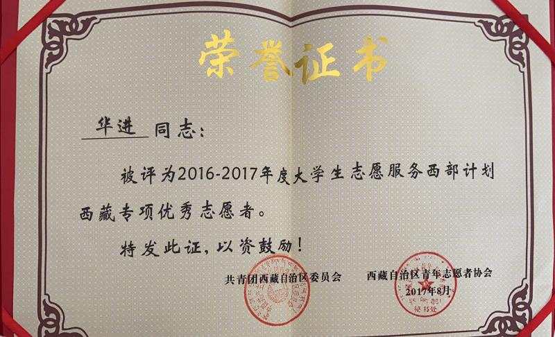 经过1年的历练,华进对西藏的精准扶贫工作有了更深层次的认识和理解,继续投入到全区脱贫攻坚工作中,圆满完成了他两年的志愿服务工作,并获得“西藏自治区西部计划优秀志愿者”荣誉称号。
