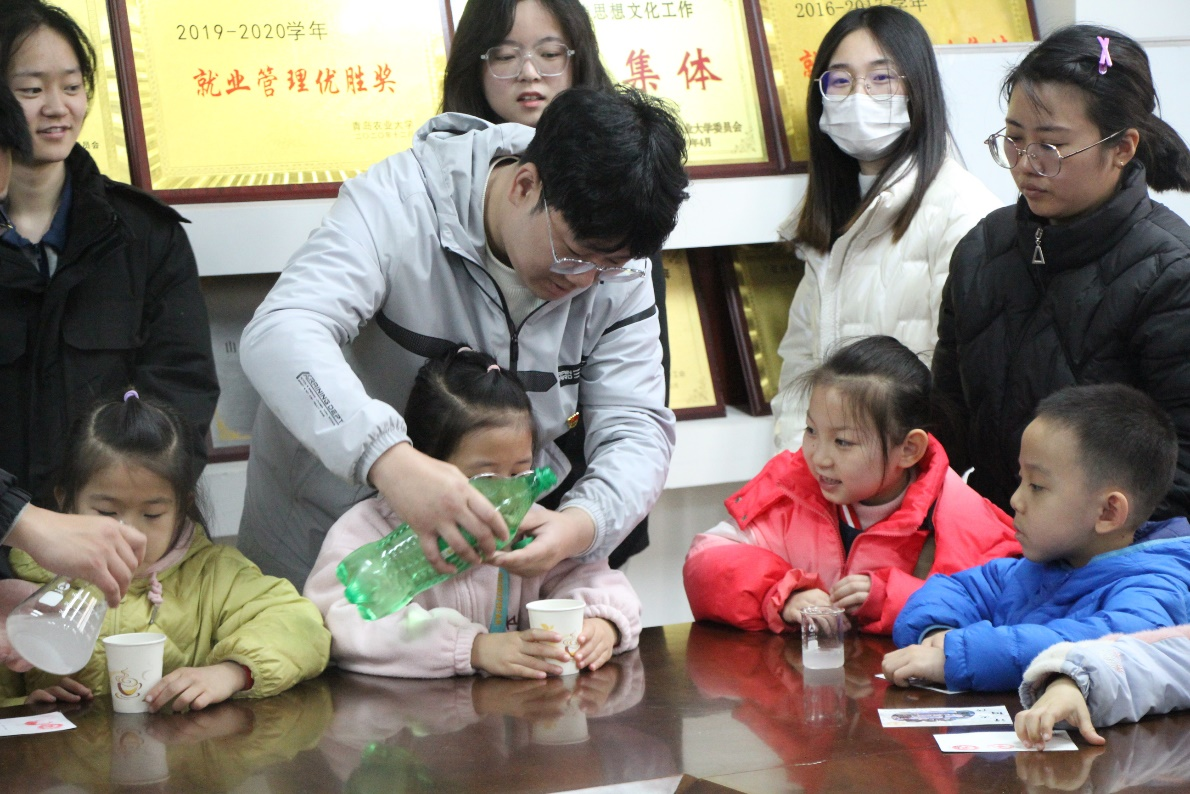 研学过程中,支部三十余名党员组成志愿者团队参与到活动中来。考虑到本次研学活动面向幼儿园小朋友,支部党员志愿者采用“一对一”形式,协助幼儿园老师、社团志愿者维持秩序,保障活动安全、有序进行。在参观实物元素周期表过程中,党员志愿者们协助社团讲解员进行实物元素讲解科普,帮助幼儿园小朋友了解生活中的化学元素。在化学科普大讲堂上,志愿者们协助开展“法老之蛇”、“大象牙膏”等趣味化学实验,在志愿者们的带领下幼儿园小朋友们自己动手完成实验,体会科学魅力。