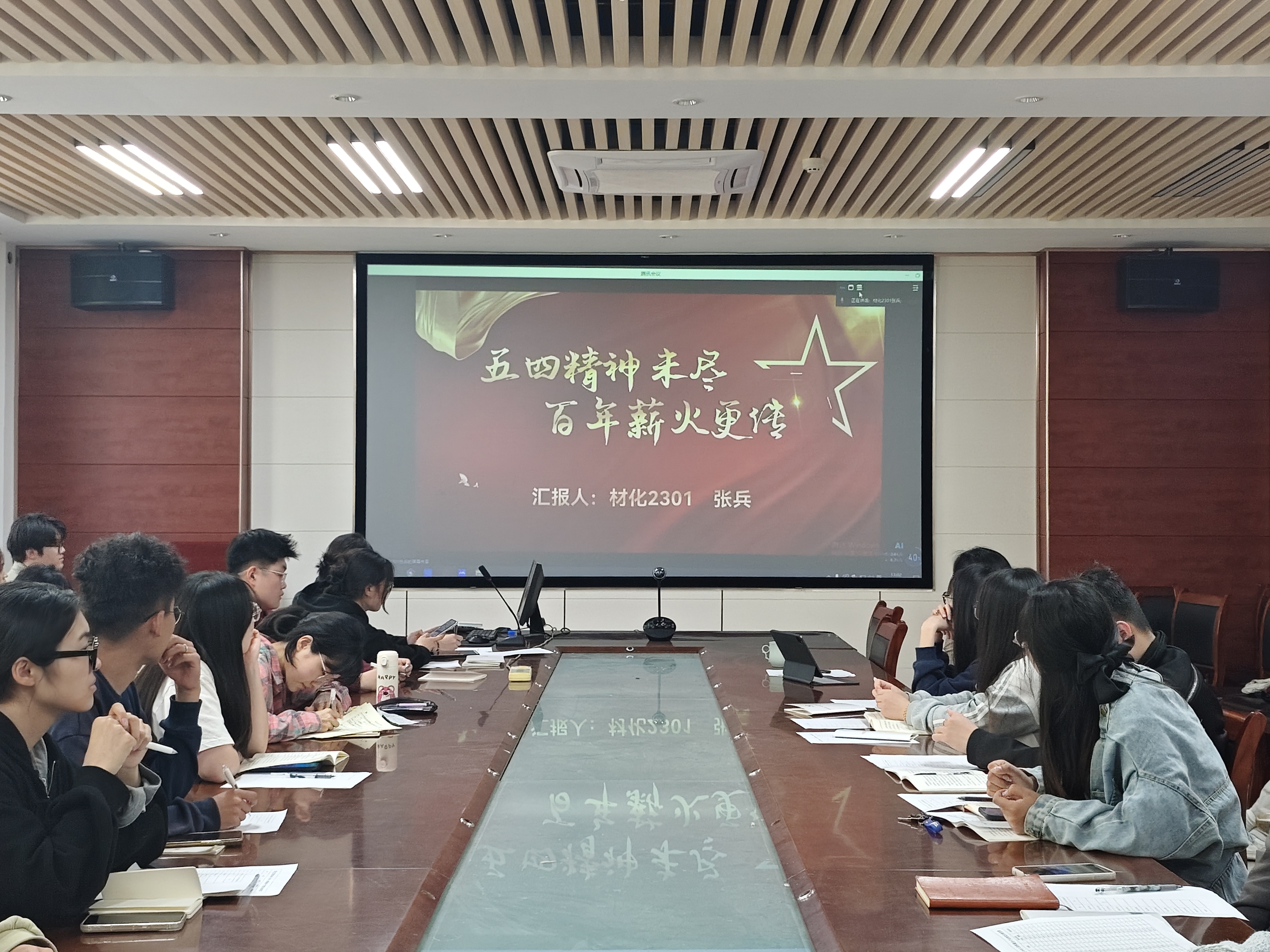 比赛活动现场,各位参赛选手围绕五四团课主题,运用多媒体技术,将视频、动画等元素融入团课讲解中,从不同角度向大家讲述了五四运动的相关历史、精神内涵以及重要意义。材化2301班张兵通过向大家讲述五四运动的代表人物向大家讲述五四精神的重要意义,倡导同学们珍惜今天的幸福生活,努力做对国家、对社会有贡献的人。材料2302班马可新以“传承五四精神,勇担时代使命”为主题,讲述了五四精神的重要内涵,并通过身边的五四青年标兵等实例,阐述继承和发扬五四精神的重要性。各位参赛选手层层深入,为在场同学讲述了五四运动这段历史,使同学们深刻认识红色政权来之不易、新中国来之不易、中国特色社会主义来之不易,激励着广大青年传承五四精神,赓续红色血脉,为国家富强、民族振兴、人民幸福而不懈奋斗。