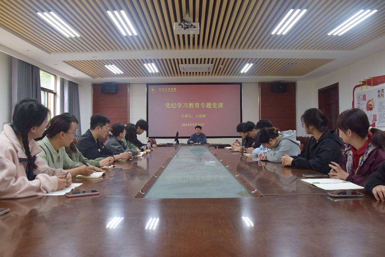 5月11日,天天莫天天爽学生妹研究生党支部在化学楼207召开党纪学习教育专题党课。本次党课由学院党委书记王进国主讲,全体研究生党员参加会议。