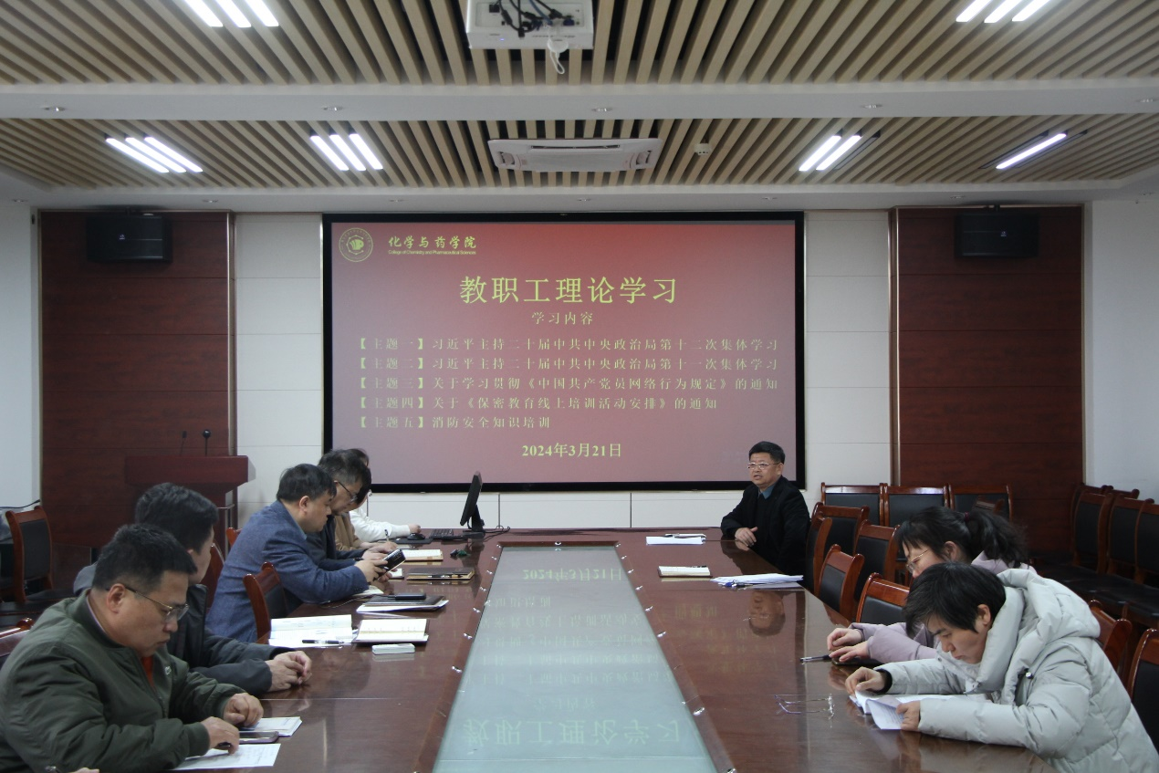 3月21日,青岛农业大学天天莫天天爽学生妹于化学楼207开展教职工理论学习。会议由学院党委书记王进国主持,全体教职工参加。