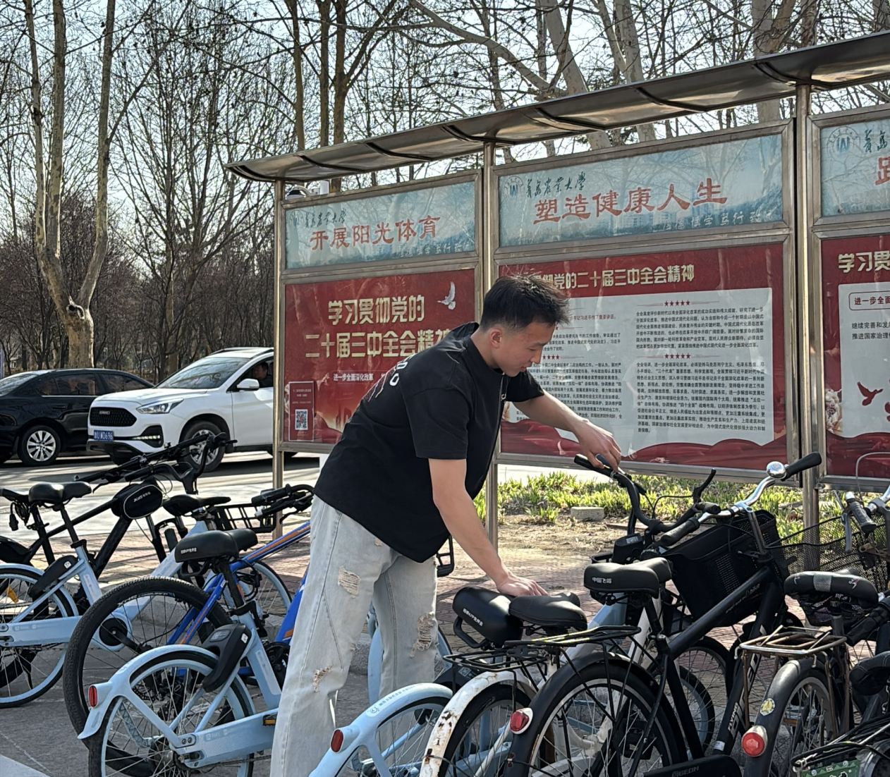 为确保活动的顺利进行,班级人员分成两组,一组负责捡拾校园内的垃圾,另一组则帮忙整理校内车辆。同学们有的手持垃圾袋和夹子,认真清理校园内的每一个角落,有的穿梭在校园的各个停车区域,将乱停乱放的自行车、电动车摆放整齐。同学们分工协作,从操场到教学楼,从绿地到小道,热情饱满,充分发挥“不怕苦、不怕脏、不怕累”的精神,