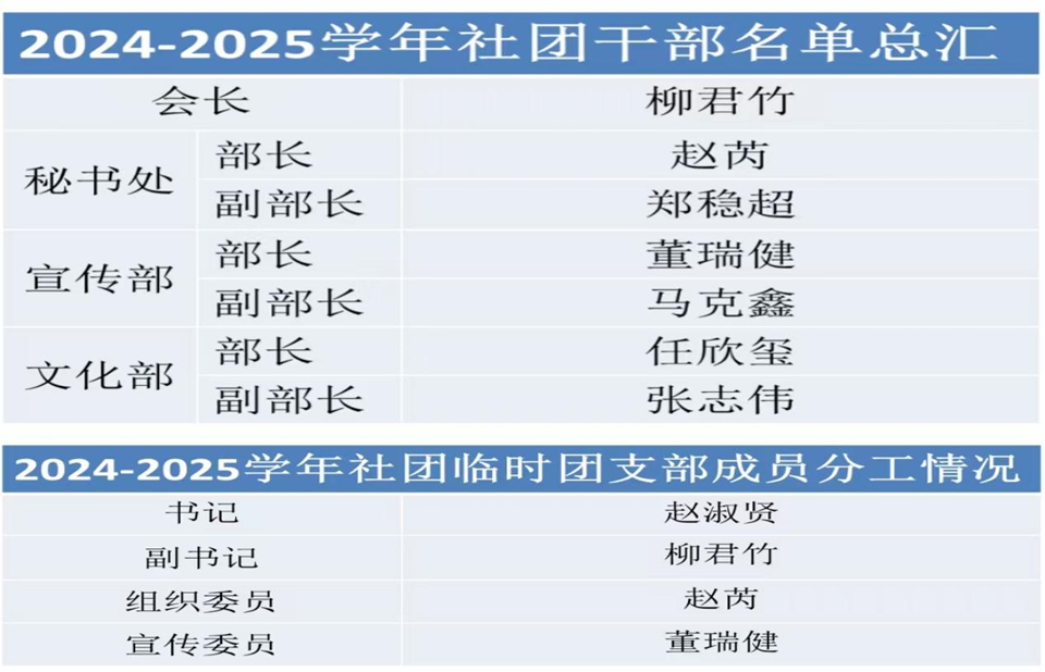大会开幕环节,社团书记赵淑贤公布了新一届社团干部名单,并介绍了临时团支部委员会的成员及其职责分配。