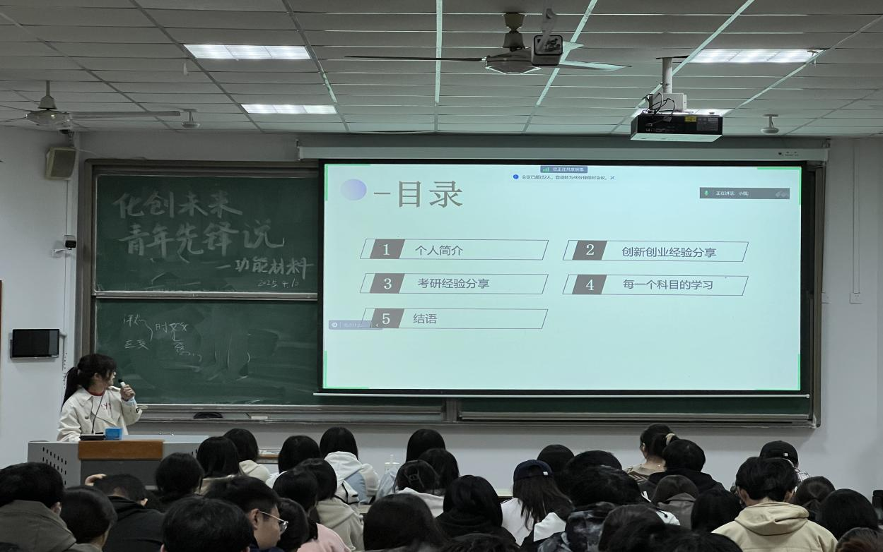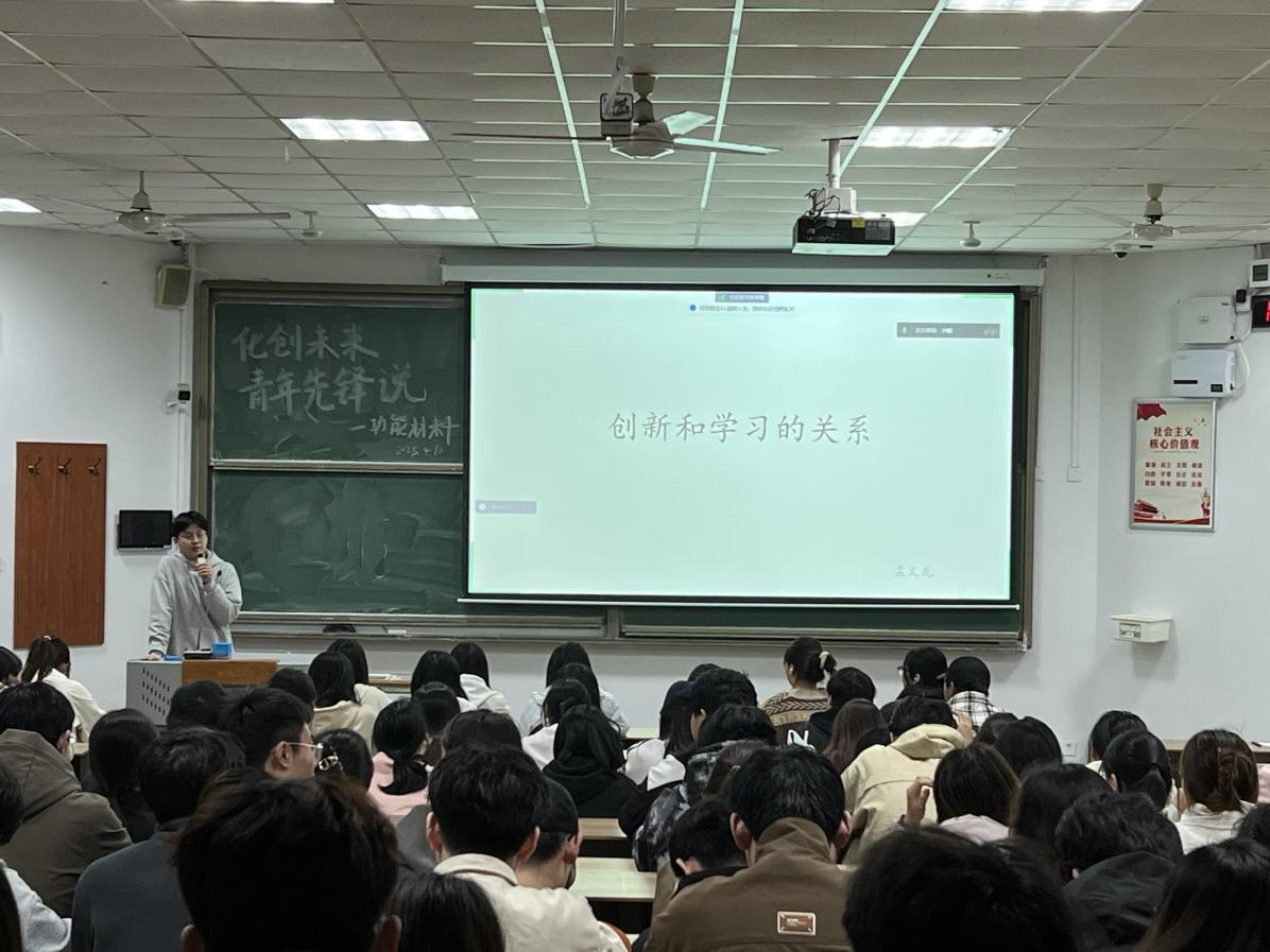 首场创新创业青年先锋说活动于2025年4月10日在城阳校区B201成功举办,本次邀请了功能材料2102班贾莹蕊和功能材料2101班孟文龙两位学生代表进行了有关创新创业和考研的经验分享。