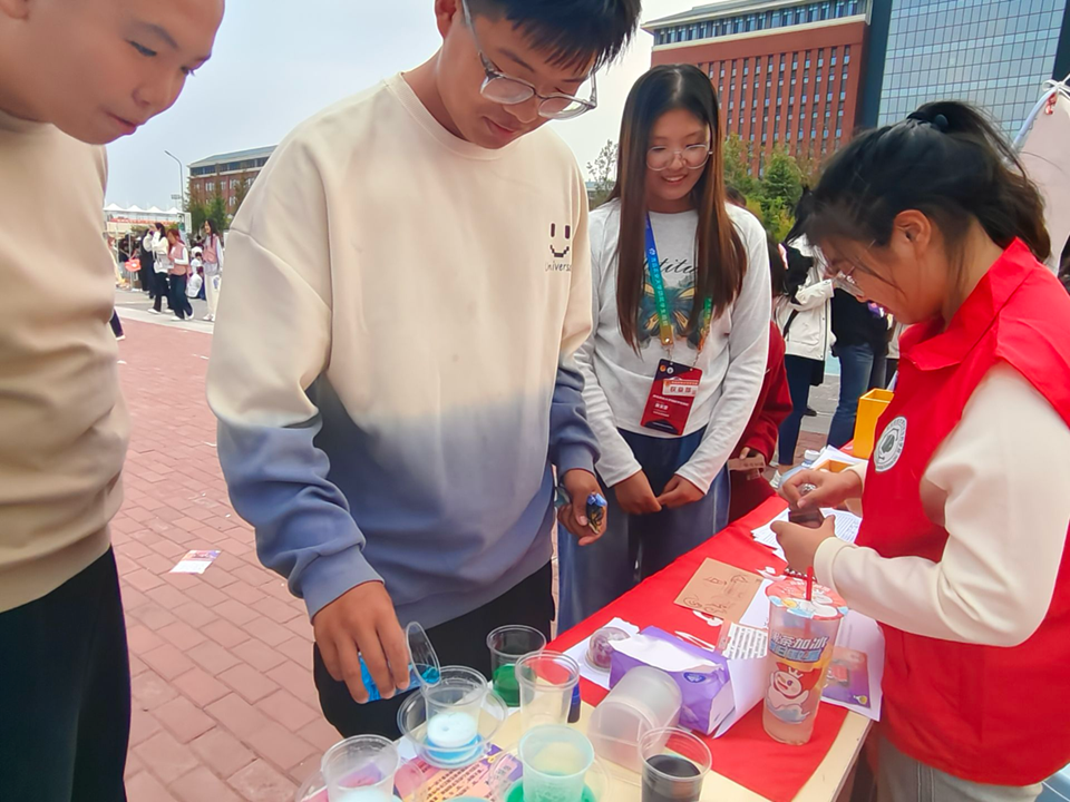 为了更好的吸引新生,社团还设置了实验展示区。桌子上摆放着一瓶瓶五颜六色的试剂,社团成员们在一旁讲解实验原理,鼓励新生亲自动手操作实验。此举不但取得了良好的纳新效果,而且让新生们更好的了解到了社团的魅力。