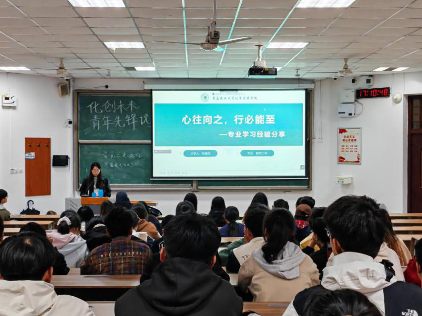 随后,林鑫蕊进行精彩分享,她通过生动详实的个人成长案例,不论是专业学习还是科研竞赛,都提出了自己作为学姐的独特见解和深切体会。为在场学弟学妹们提供了兼具理论高度和实践价值的指导意见。其深入浅出的讲解不仅帮助同学们明晰了学业规划方向,更以鲜活的科研经历点燃了大家的创新激情,现场反响热烈。