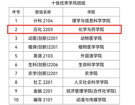 应用化学专业 2203 班以严谨笃学的班风获评“十佳优秀学风班级”。班级成员相互激励,共同进步,形成了浓厚的学习氛围,以扎实的专业成绩和出色的实践能力,为学院树立起学风建设的标杆。