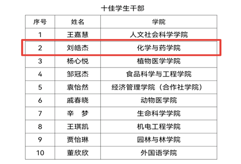 刘皓杰凭借出色的组织协调能力、强烈的责任感及突出成绩荣获“十佳学生干部”荣誉称号。他始终秉持着全心全意为同学服务的工作初心,在班级和学院活动中积极作为,妥善平衡学业与工作,展现出新时代学生干部的担当与风采。