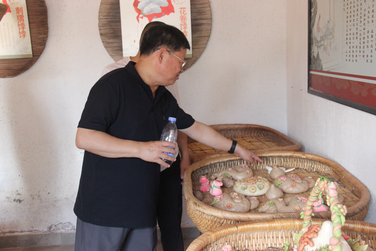 学院老师们同实践团成员来到面食文化博物馆,共同体会胶东地区深厚的面食文化底蕴。面食记忆馆内,由面团塑造的一个个小人、生肖以及各种动画IP,色彩艳丽、生动有趣,传统技艺与现代艺术的碰撞,让实践团领略非遗的魅力。小麦长歌展区内,收割小麦的石铲刀,小麦播种用的点葫芦,收储小麦用的升、斗等农作工具,无不体现了胶东先民耕作过程中的勤劳和智慧。在参观过程中,王进国拿起手中的竹篮向实践团成员讲述它背后的故事,让年轻学子们体会到这些农具承载着土地记忆与温度。来到七巧工坊,于博清向师生们介绍造型各异的巧饼也同样蕴含了当地人民的对未来的向往,有新生儿三日送“喜面”、百日蒸“百岁馒头”,老人过寿要用“九桃一手”,盖新房要“狮虎把门,金龙绕梁”,让实践团成员真切感受到了面团背后“蒸蒸日上”的民生。