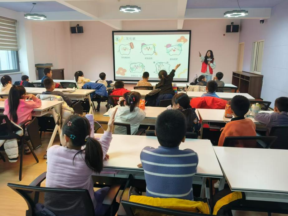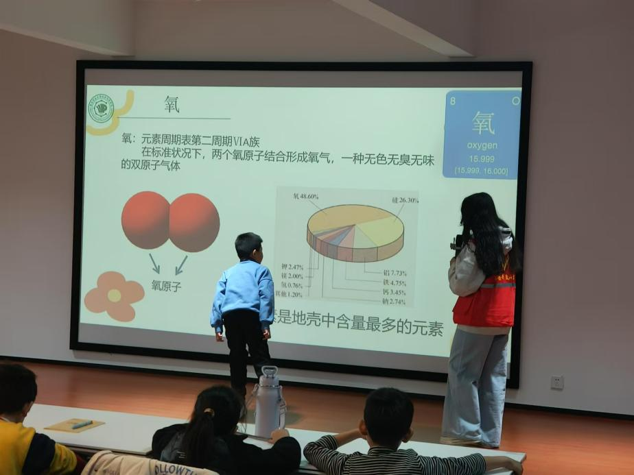 随着活动的深入推进,孩子们对化学的学习兴趣也逐渐提高,在课堂和课间都积极踊跃地与实践队员交流互动。在《人体中的化学》课程中,实践队员通过直观的图表和生动的例子详细讲解了氧气和二氧化碳在人体中的作用,并现场演示了蛀牙的形成过程,引导孩子们关注口腔健康,养成良好的生活习惯。