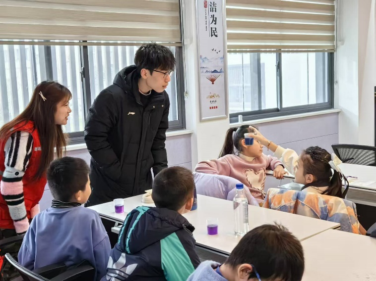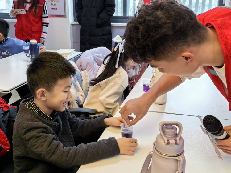 活动以以小朋友们熟知的热门动漫为切入点,选取有趣剧情,深入剖析其中的化学原理。 为让孩子们理解化学反应本质,队员们结合剧情设计“蝶豆花茶变色实验”,亲自示范操作,引导孩子们观察颜色变化,激发他们对化学知识的兴趣。实验课后,实践队员郑稳超开展“党史专题教育”。他以提问开场,通过问答、播放视频和展示照片等形式,进行党史常识问答。课堂尾声,全体师生合唱《歌唱祖国》,爱国之情在心中升腾。下午,实践队员配合东方社区课程,为孩子们带来数学益智游戏。他们设计多个融入数学知识的小游戏,孩子们踊跃举手,专注计算,在欢乐中学习数学知识。