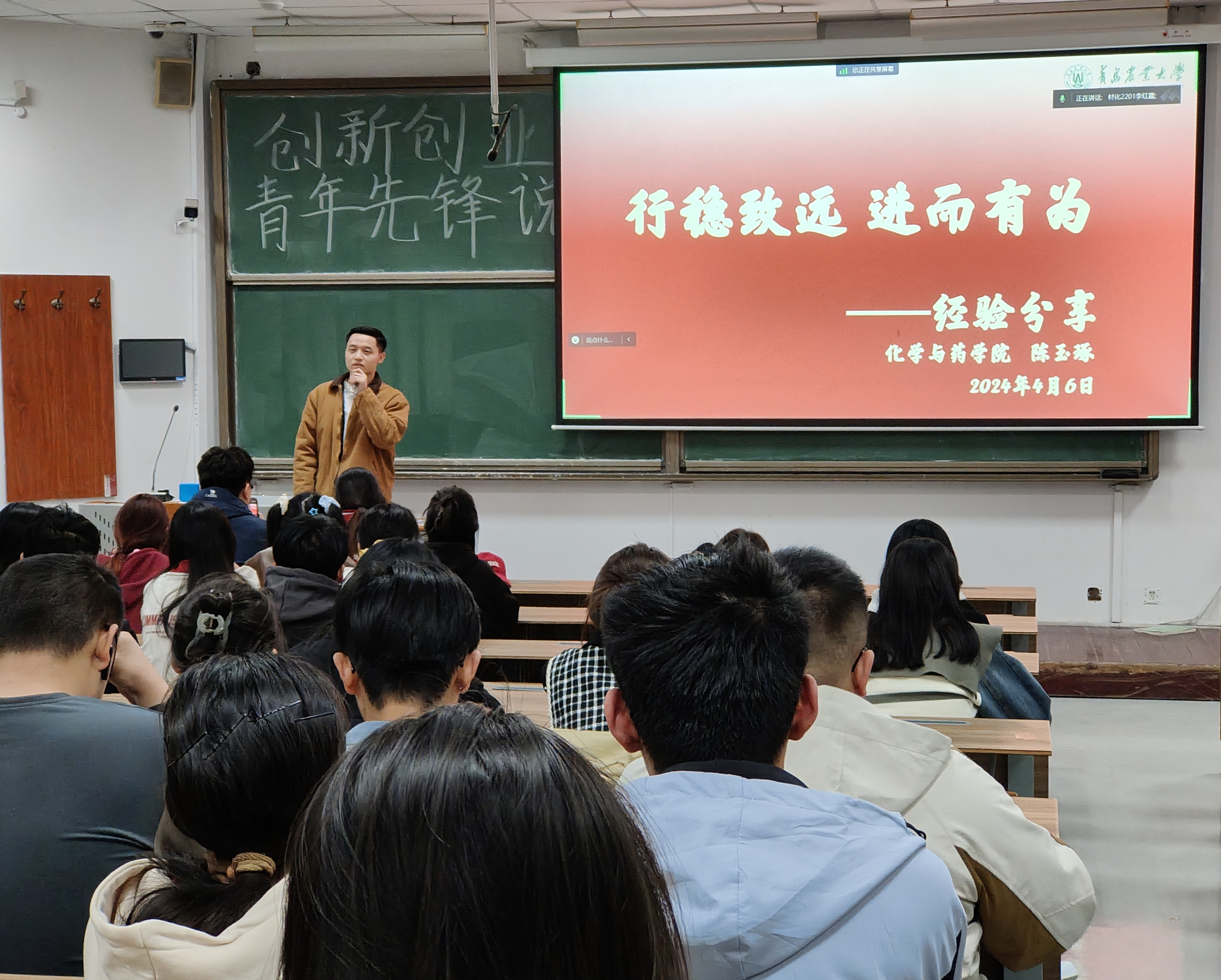 为激发同学们参与科技创新实践的热情,增强创新意识,营造浓厚的创新创业氛围, 4月7日,青岛农业大学天天莫天天爽学生妹于教学楼B101开展“行稳致远,进而有为——经验分享”主题讲座。本次讲座由功能材料2002班优秀双创代表陈玉琢主讲,2022级材料化学、功能材料专业全体学生参加。