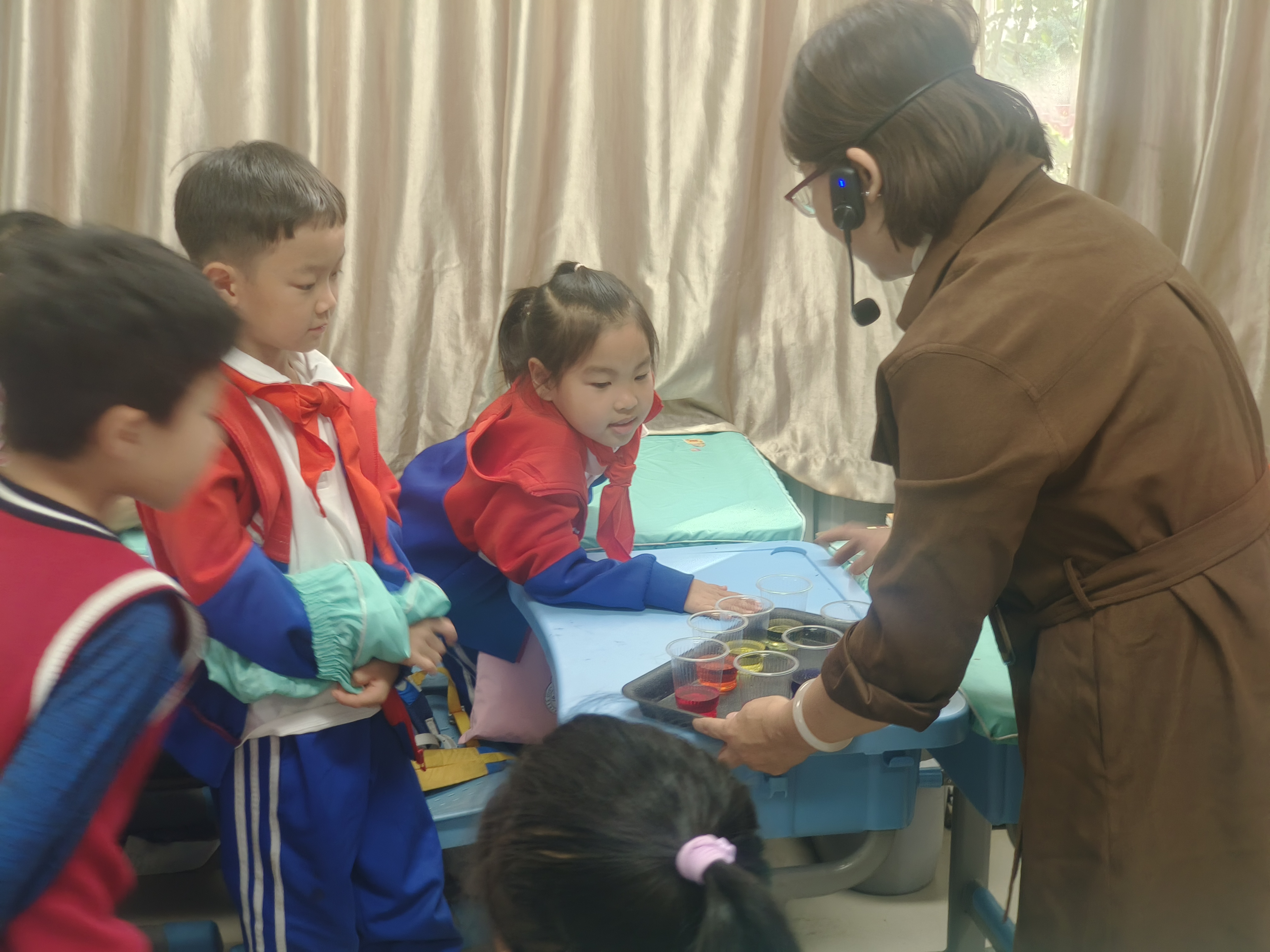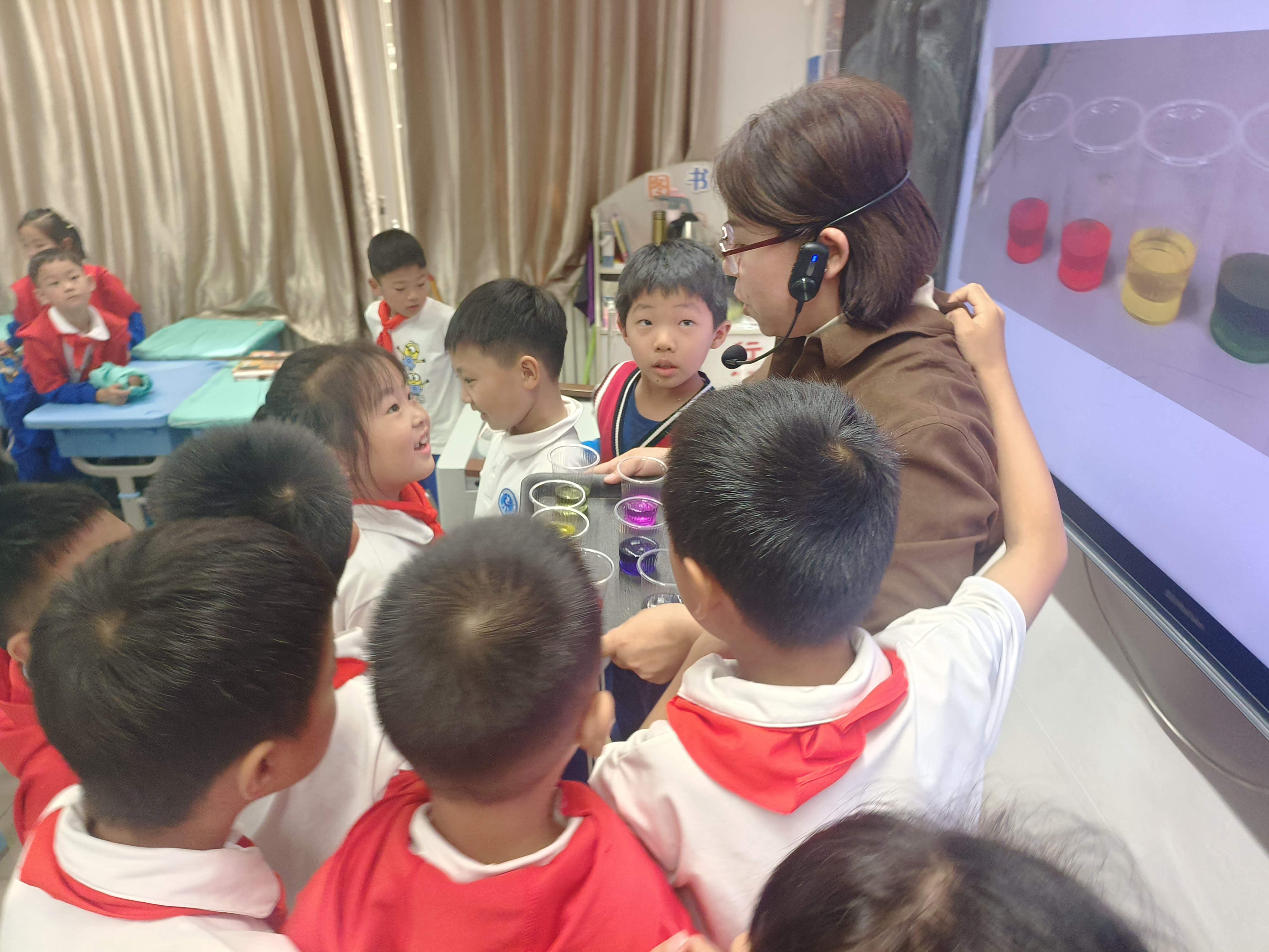 在宣讲结束后,团队成员带领孩子们一起动手进行了有趣的化学小实验——《香草奶昔》。实验前,队员首先强调了实验安全的重要性,确保每个孩子都能在安全的环境下进行探索。随后,她依次介绍了实验所需的药品:白醋、洗洁精、色素和小苏打,并引导孩子们按照实验步骤将药品加入塑料杯中。当一股股彩色的泡沫瞬间喷涌而出时,孩子们兴奋地欢呼起来,纷纷惊叹于化学的神奇魅力。
