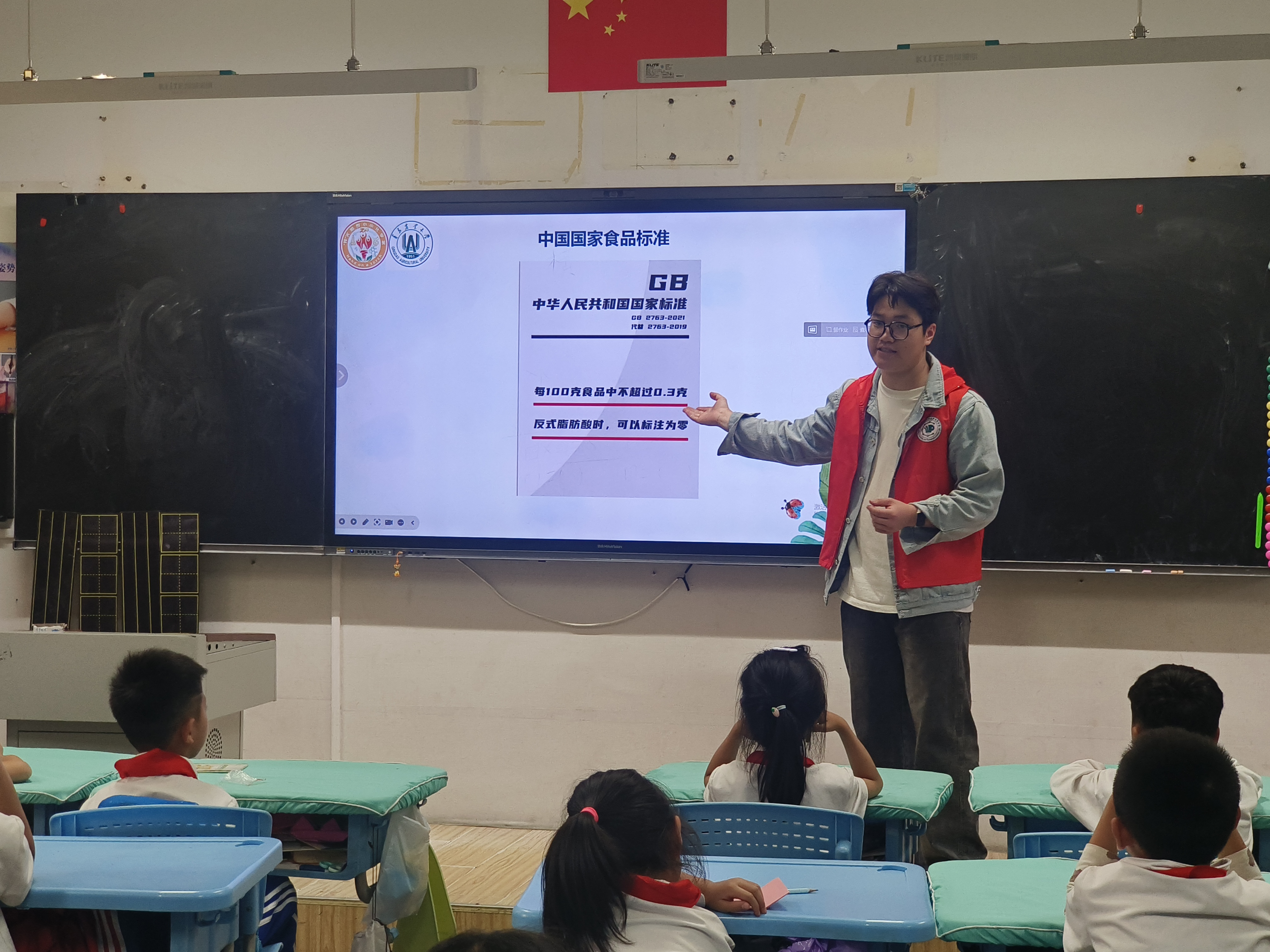 随后,团队队员为孩子们带来了一场精彩纷呈的化学科普宣讲——《警惕食品中的“定时炸弹”——反式脂肪酸》。他用通俗易懂的语言,详细阐述了反式脂肪酸如何影响人体内胆固醇的平衡,增加心脑血管疾病的风险,以及其发胖能力远超普通脂肪酸七倍的事实。同时,他还特别强调了反式脂肪酸的来源和常见食品中的存在情况,引导孩子们学会辨别食物中的反式脂肪酸,培养健康饮食习惯。