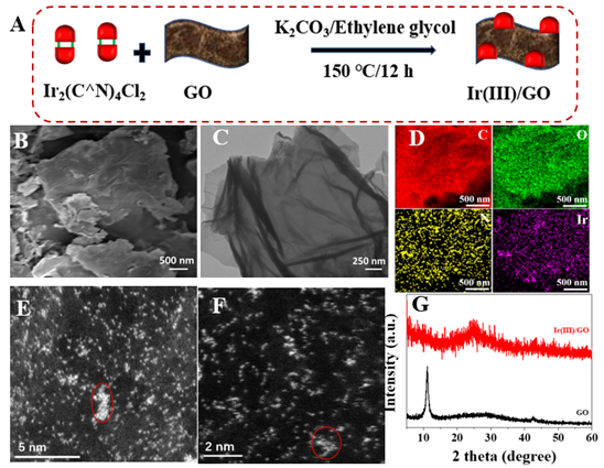 要点1. 氧化石墨烯具有丰富的含氧基团,如:-O-、-(CO)-、-OH、-COOH,可以提供二羰基结构作为O^O配体与Ir(III)配合物配位,从而将Ir(III)配合物与C^N配体锚定在氧化石墨烯(GO)纳米片表面,制备高活性的铱单原子纳米酶[Ir(III)/GO]。