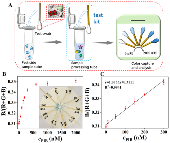 要点3. 检测平台被制成便携式检测试剂盒,由检测拭子和样品处理管组成,能够以裸眼和手机读色的方式有效监测果蔬中的PIB。