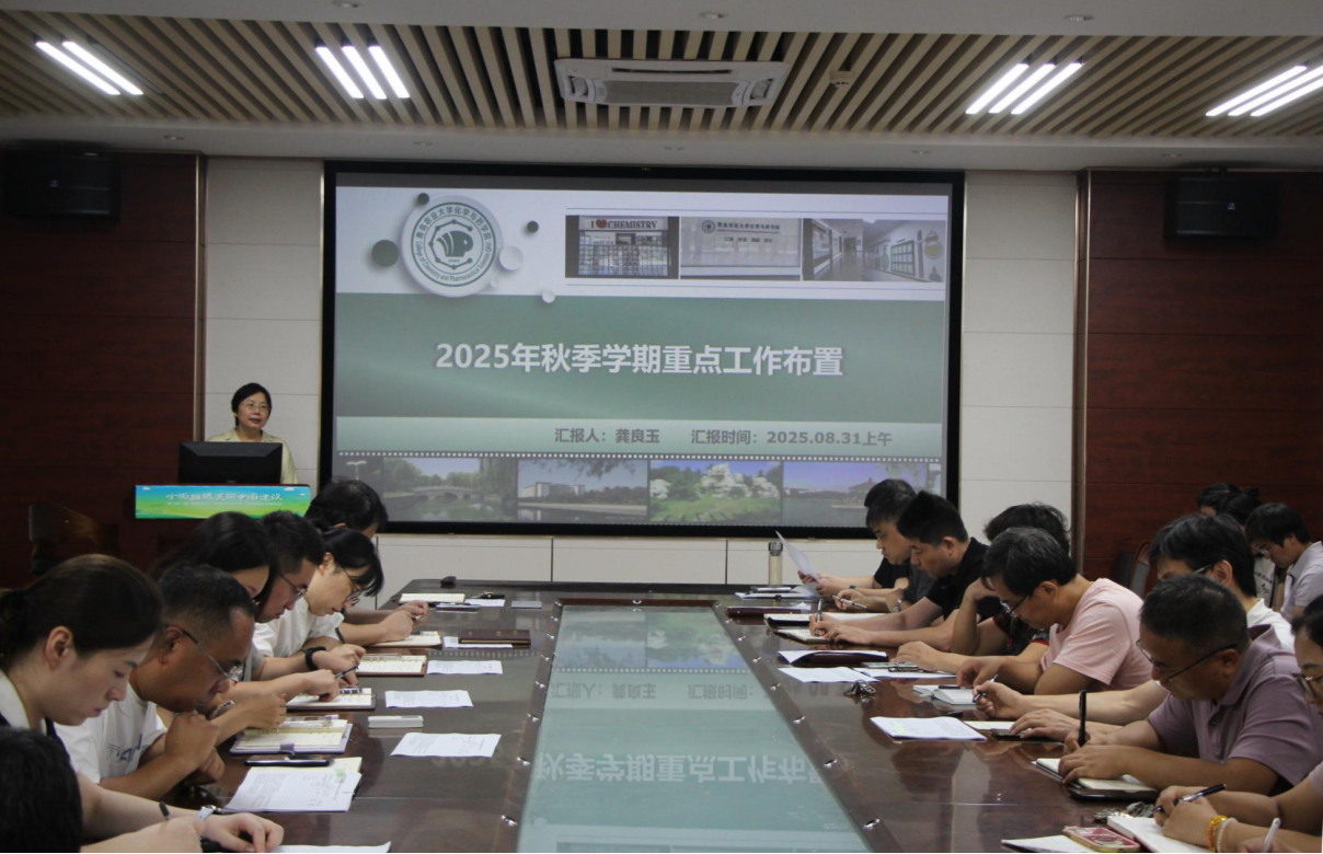 院长龚良玉围绕2025年秋季学期重点工作布置展开汇报。她首先回顾了暑假期间学院重点工作任务的推进,对全体教职工在工程认证、学科发展规划、校外交流学习、科研工作等方面的辛勤付出和取得的成效给予了充分肯定。在此基础上,她从三方面明确了秋季学期核心任务:一是聚焦人才引育,关注政策动态,在人才申报与培育上完善措施,补齐队伍建设短板;二是强化学科发展,立足农化特色,深化内涵建设,增强学科核心竞争力;三是抓实人才培养,深化教育教学改革,提升学风建设质量,夯实人才培养质量根基。