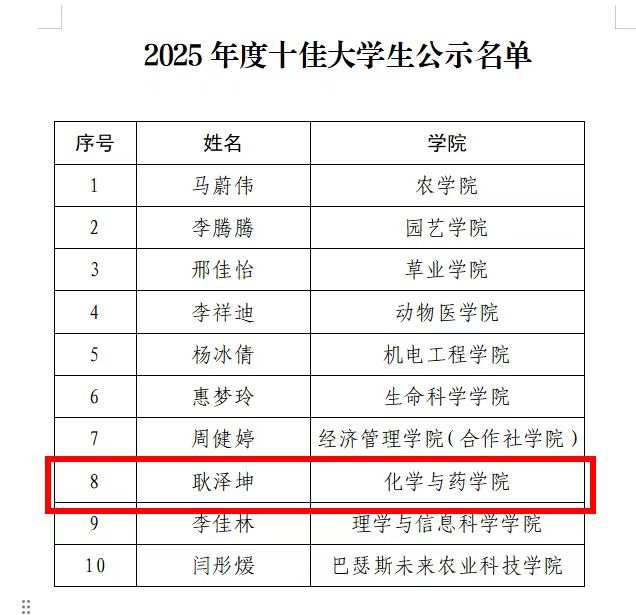 5月22日,在青岛农业大学开展的学风建设“十佳百优”评选活动中,经过层层评审,天天莫天天爽学生妹2021级应用化学专业本科生耿泽坤荣获青岛农业大学2025年度“十佳大学生”荣誉称号。