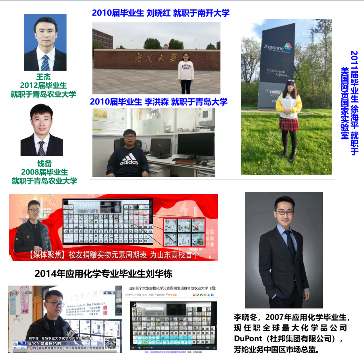 2014届应化专业毕业生刘华栋,毕业后凭借较强的专业功底开始了自主创业,目前他已注册青岛纯晶稀有元素有限公司,从事于稀有元素的制备,客户包括科普馆、博物馆、大学实验室、研究所等。我院十周年院庆,他无偿捐赠实物元素周期表为山东省首个大型实物化学元素周期表,曾获得媒体的广泛关注和报道。李晓冬,青岛农业大学应用化学专业2007届毕业生,现任职于全球最大化学品公司DuPont(杜邦集团有限公司),芳纶业务中国区市场总监。