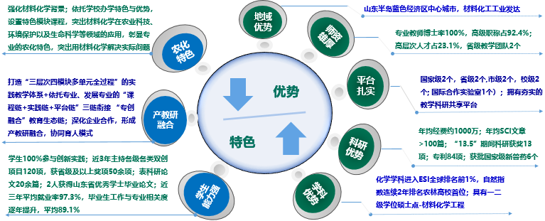 专业培养特色:在学校办学思想的指引下和长期的办学实践中,结合学校的农科特色和优势,立足于农化行业,强化以化肥农药控释材料、可降解农膜新材料、新型农药和农药残留检测传感材料等实践需求为导向,理论与实践深入融合,突出材料化学在农业、食品、环保等领域的应用,彰显农化新材料特色。