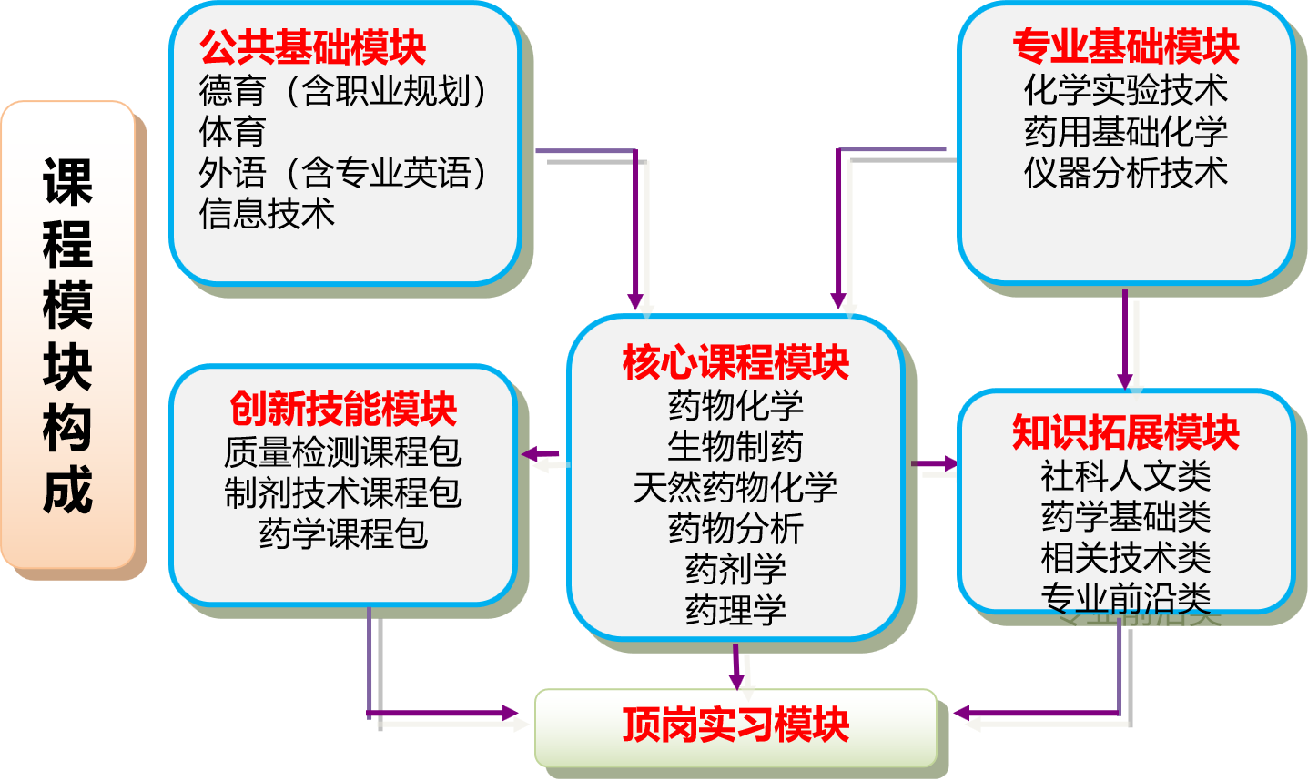 课程体系设置:药学专业以医药为基础,构建了以公共基础模块、专业基础模块、核心课程模块、创新技能模块、知识拓展模块和顶岗实习模块互为支撑的课程体系。