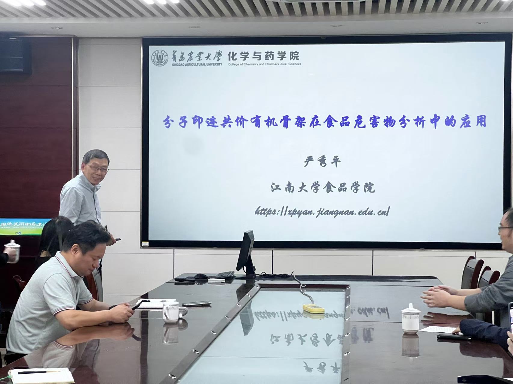 2024年10月12日,课题组邀请江南大学严秀平教授、中山大学欧阳钢锋教授到课题组指导工作,并分别作了题为《分子印迹共价有机骨架在食品危害物分析中的应用》、《多孔晶态框架限域级联传感与过氧化氢光催化合成》的精彩报告。