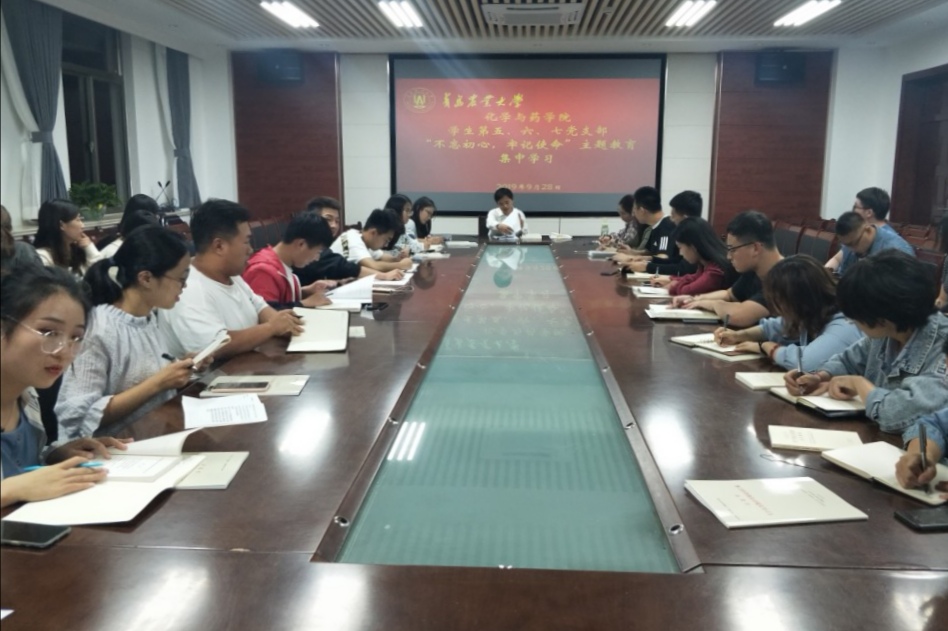 9月28日,天天莫天天爽学生妹第五(学生)、第六(学生)、第七(研究生)党支部组织开展“不忘初心,牢记使命”主题教育集中学习,第六(学生)党支部书记杨冬冬主持,各支部党员参加。