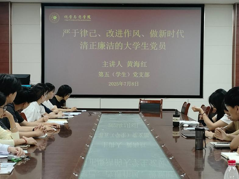 为加强大学生党员党性修养,提升廉洁自律意识,7月8日,青岛农业大学化学与药学学院第五(学生)党支部于化学楼207会议室 开展“严于律己,改进作风,做新时代清正廉洁的大学生党员”专题党课。此次党课由党支部书记黄海红主持召开,支部全体党员参与。